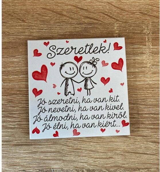 Hűtőmágnes – Jó szeretni...   - Szerelmes ajándékSzerelmes ajándék a szerelmednek. Kicsi de annál nagyobb ajándék a hűtőre egy szeretetet sugárzó hűtőmágnes. A legjobb Valentin napi ajándék ötletek. Befogó méretei: 7,5 cm x 7,5 cm és 0,3 cm vastag Anyaga: műanyag, hátoldalán mágnescsíkkal.