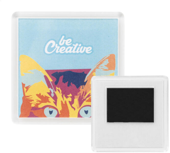 Négyzet alakú akril hűtőmágnes egyedi, full-colour papírbetéttel. Az ár tartalmazza a digitális nyomtatást. Minimális rendelési mennyiség: 100 db.
